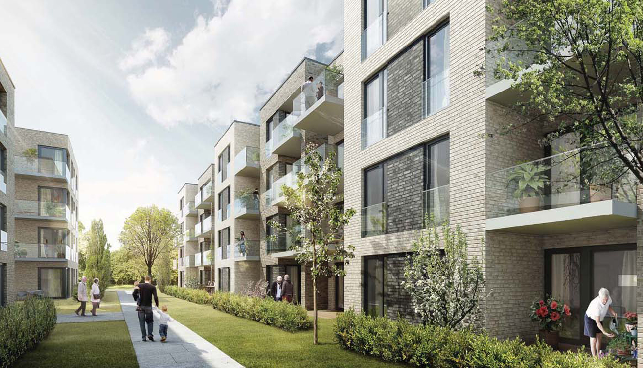 Drei Punkthäuser entlang des Erich-Wegner Wegs auf der Westseite und ein „Kettenhaus“ aus drei Einzelhäusern mit einer Stadthaus-Struktur parallel der Grundstücksgrenze auf der Ostseite zur alten Gärtnerei, bilden ein weitestgehend kleinteiliges und aufgelöstes Ensemble, soweit dies die angestrebte Baumasse ermöglicht. Sämtliche Wohnungen erhalten durch die Gebäudepositionierung eine Ost-West-Orientierung. Zur Vermittlung mit den bestehenden Einzelhäusern am Erich-Wegner Weg ist die Kubatur dort als Punkthäuser mit 3- bis 4 Geschossen gewählt, in denen die Eigentumswohnungen und ein Teil der Mietwohnungen vorgesehen sind. Auf der Ostseite des Grundstücks bildet das Kettenhaus mit 4 Geschossen einen verdichteten Gebäuderiegel für den Hauptteil Mietwohnungen.